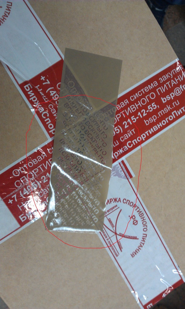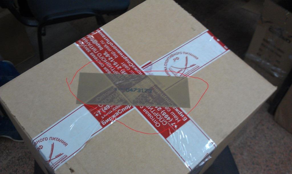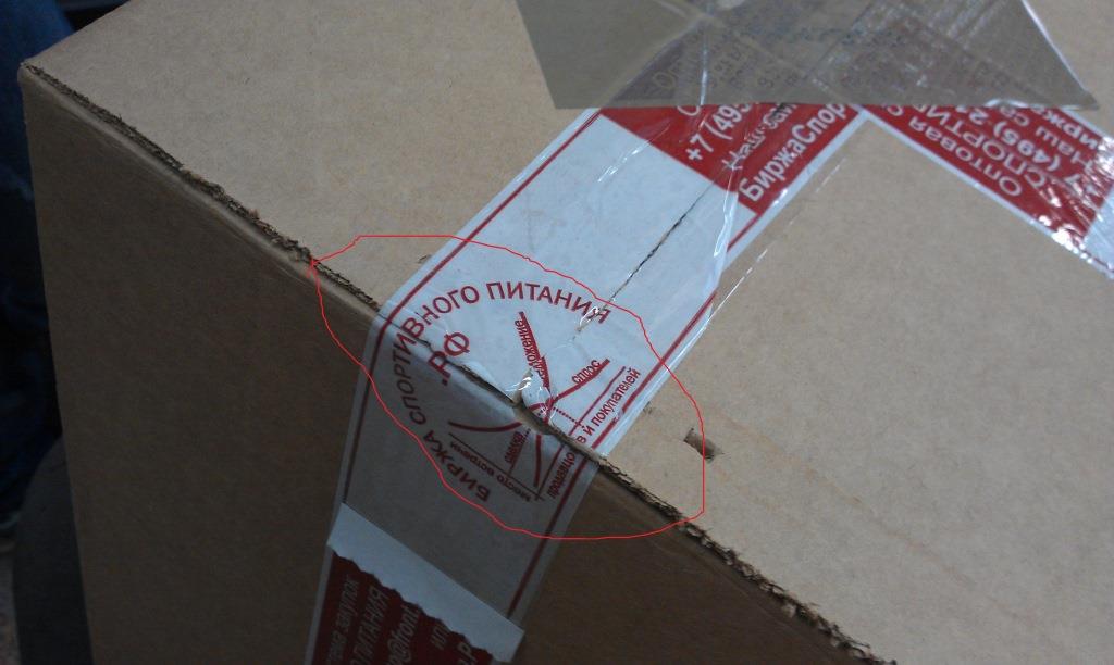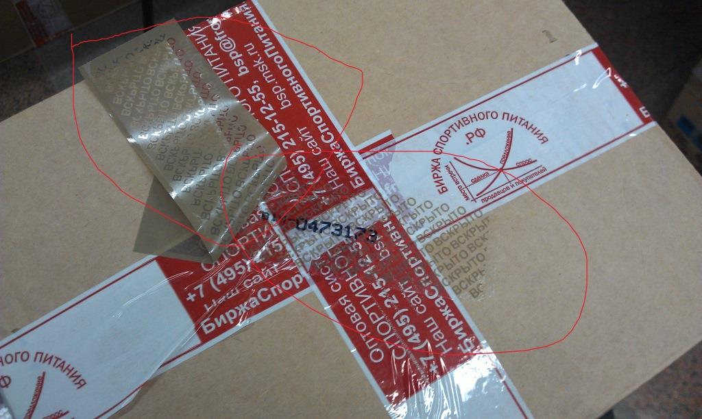 • На пересечении места обрыва фирменного скотча "БиржаСпортивногоПитания.РФ" наклеивается номерная липкая пломба с защитой от вскрытия